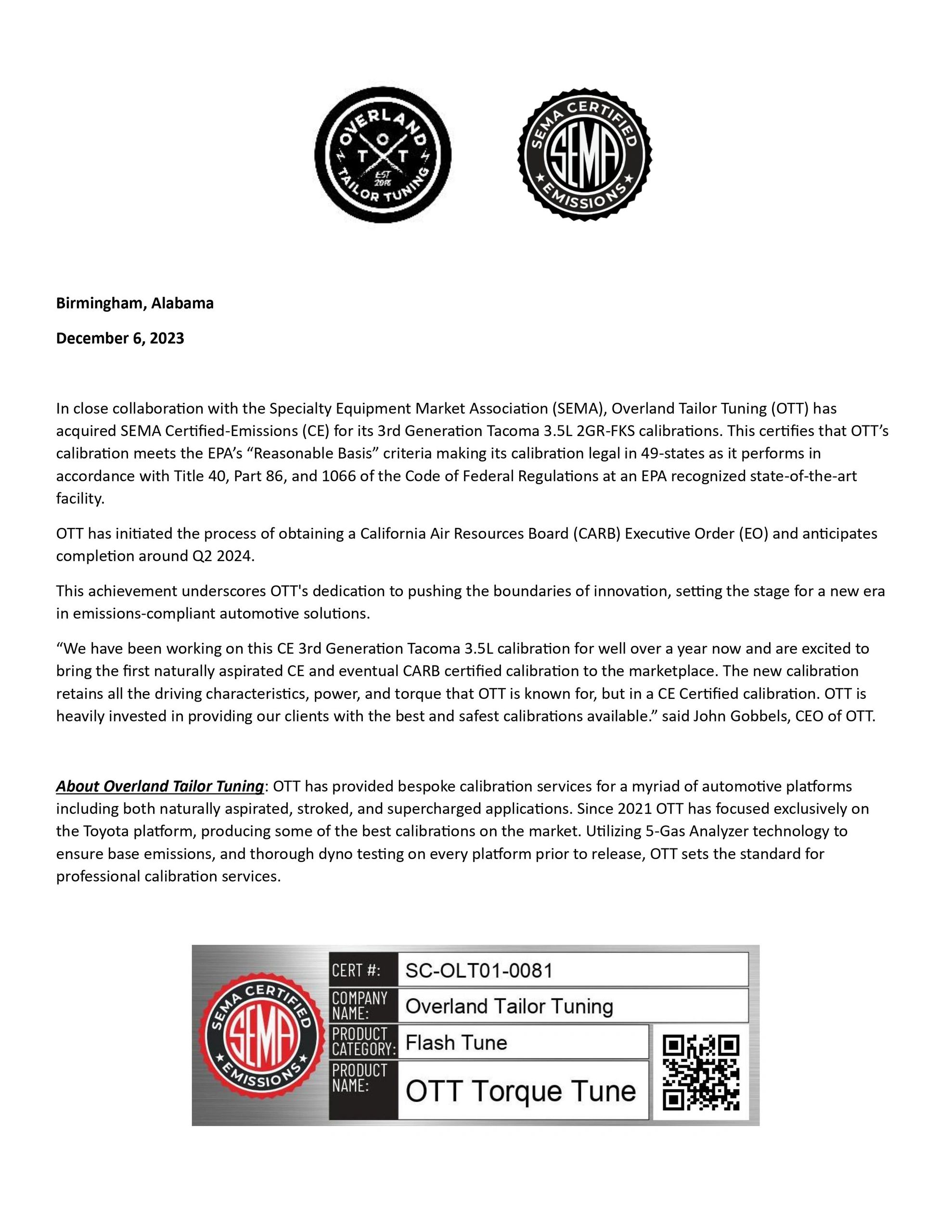 The Overland Torque Tune (OTT) has received its SEMA-CE (Certified Emissions) for the 2016-2023 3.5L 2GR-FKS 3GT.